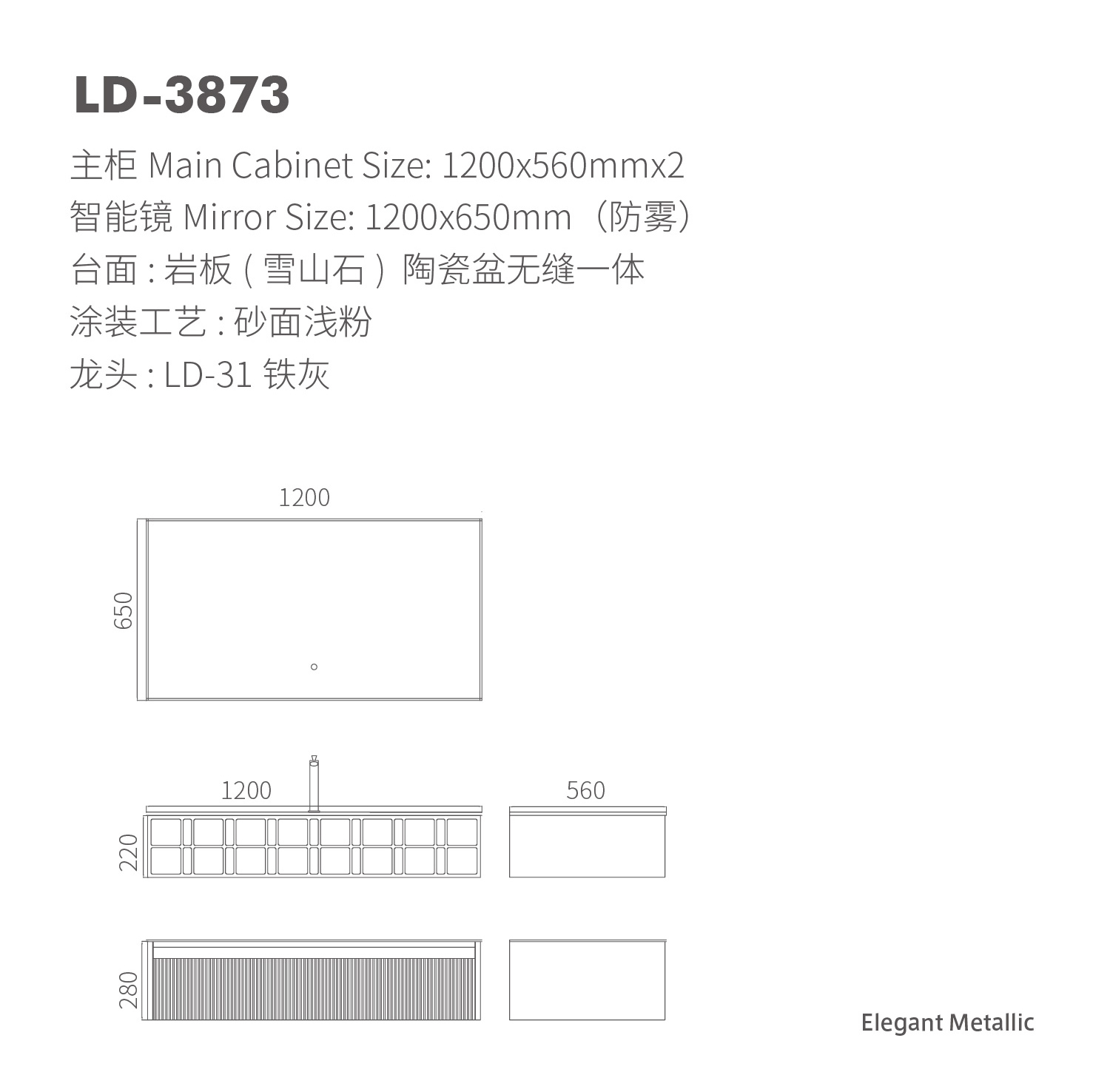 【主 柜】 Main Cabinet Size: 1200x560mmx2【智能鏡】 Mirror Size: 1200x650mm(防霧)【臺 面】 : 巖板 ( 雪山石 ) 陶瓷盆無縫一體【涂裝工藝】 : 砂面淺粉【龍 頭】 : LD-31 鐵灰