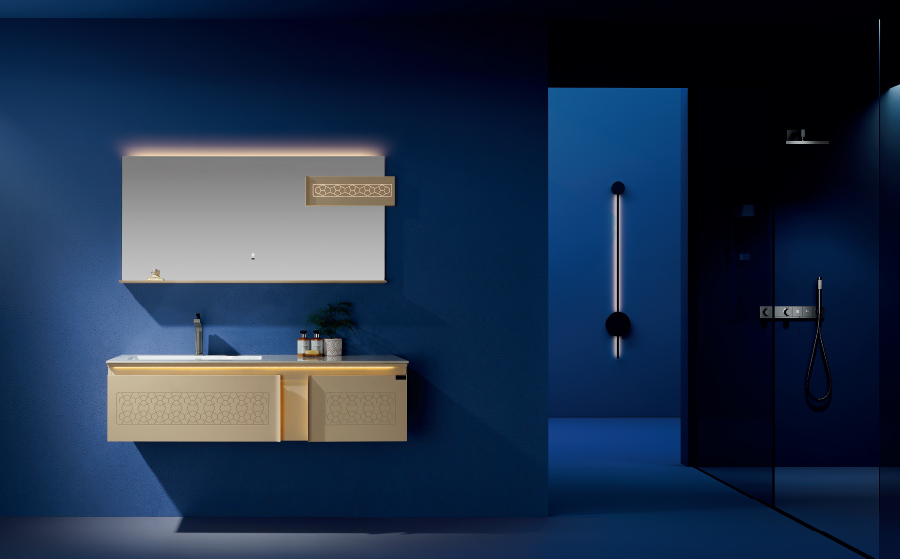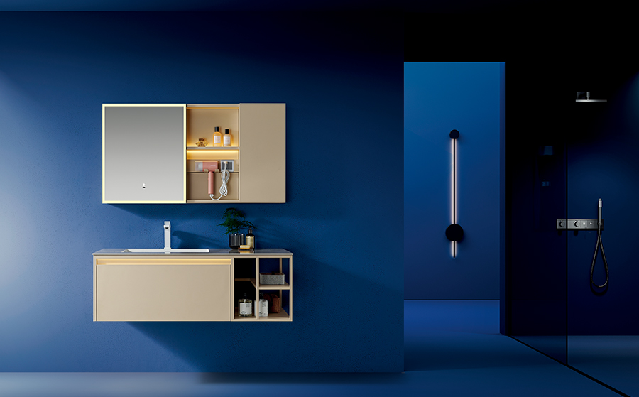 這款浴室柜獨具匠心,不僅有典雅的外觀,還隱藏著一個隱形的功能寶藏。在您的指尖,冰箱的門一打開,瞬間透露出清新的寒意。您可以隨時將美容產品、化妝品、面膜等冷藏,為您的護膚體驗帶來絕佳的享受。