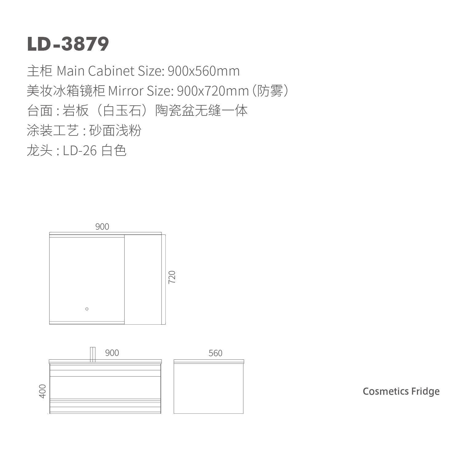【主 柜】Main Cabinet Size: 900x560mm【美妝冰箱鏡柜】Mirror Size: 900x720mm(防霧)【臺 面】: 巖板(白玉石)陶瓷盆無縫一體 【涂裝工藝】: 砂面淺粉【龍 頭】: LD-26白色