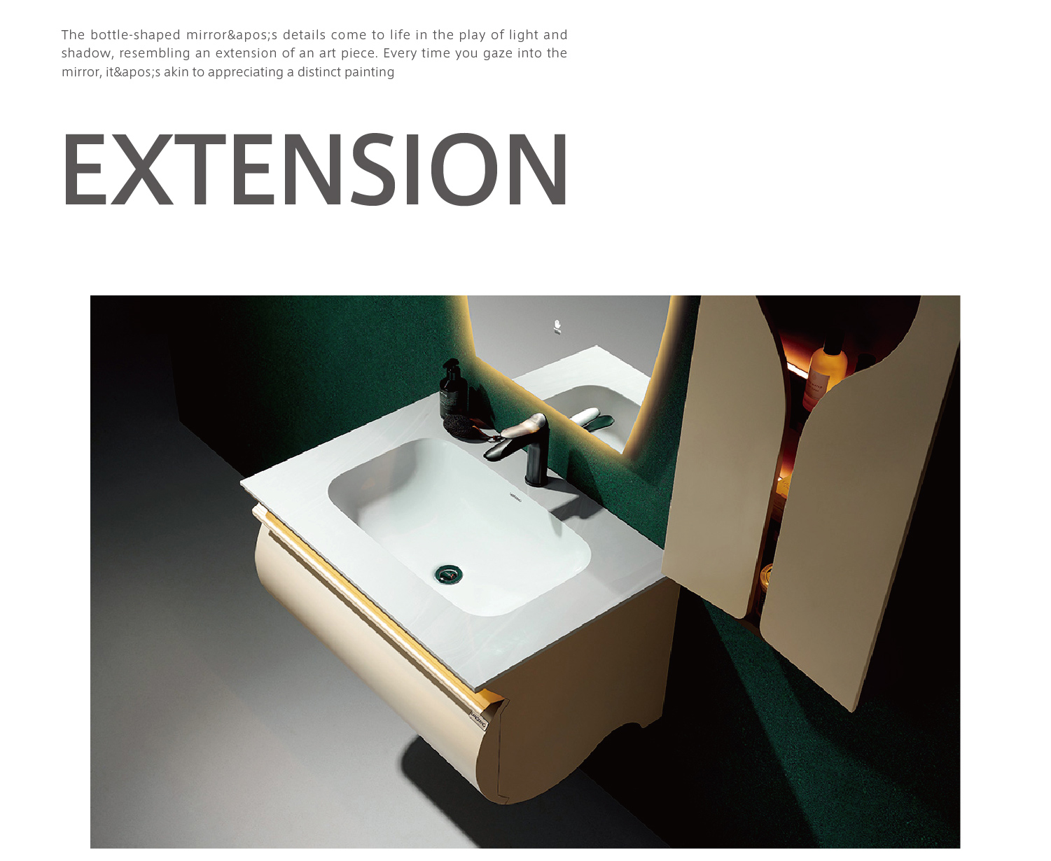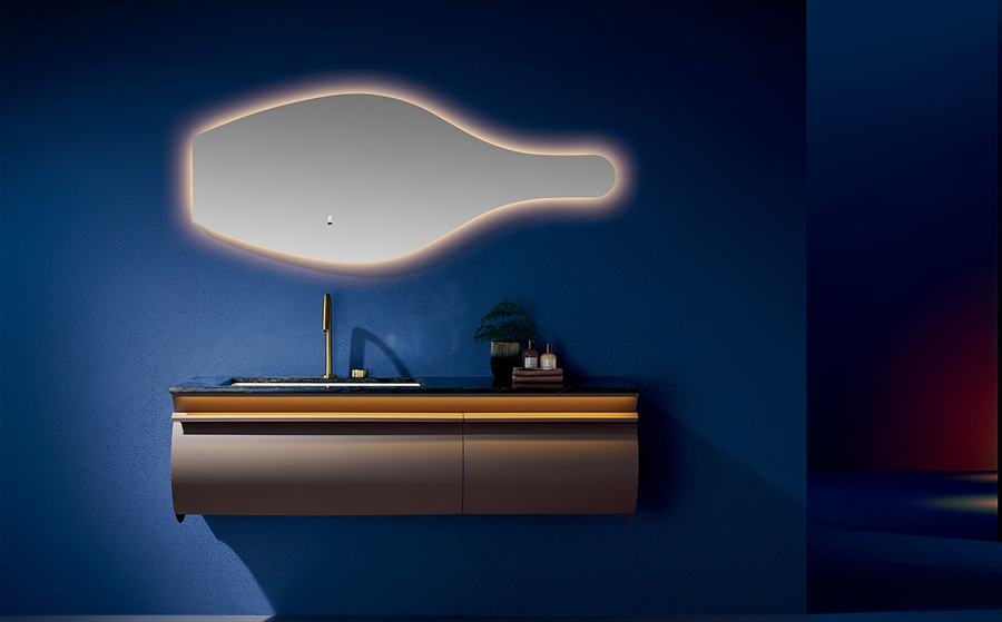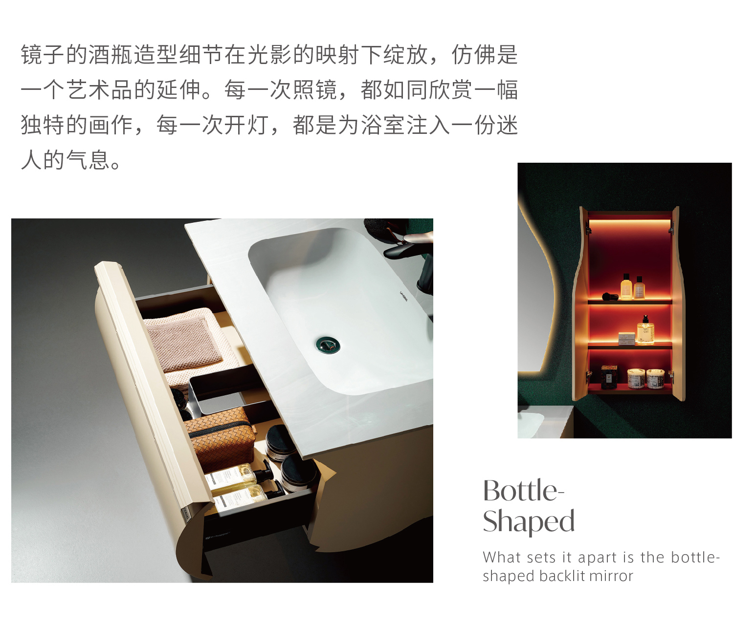 鏡子的酒瓶造型細節在光影的映射下綻放,仿佛是一個藝術品 的延伸。每一次照鏡,都如同欣賞一幅獨特的畫作,每一次開 燈,都是為浴室注入一份迷人的氣息。