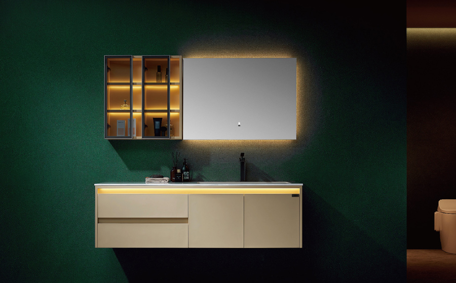 柔和的氛圍燈營造出溫馨的環境,如同輕輕的擁抱。而透光玻璃鏡柜則增添了神秘感,與光影互相交織, 勾勒出浴室的詩意畫卷。