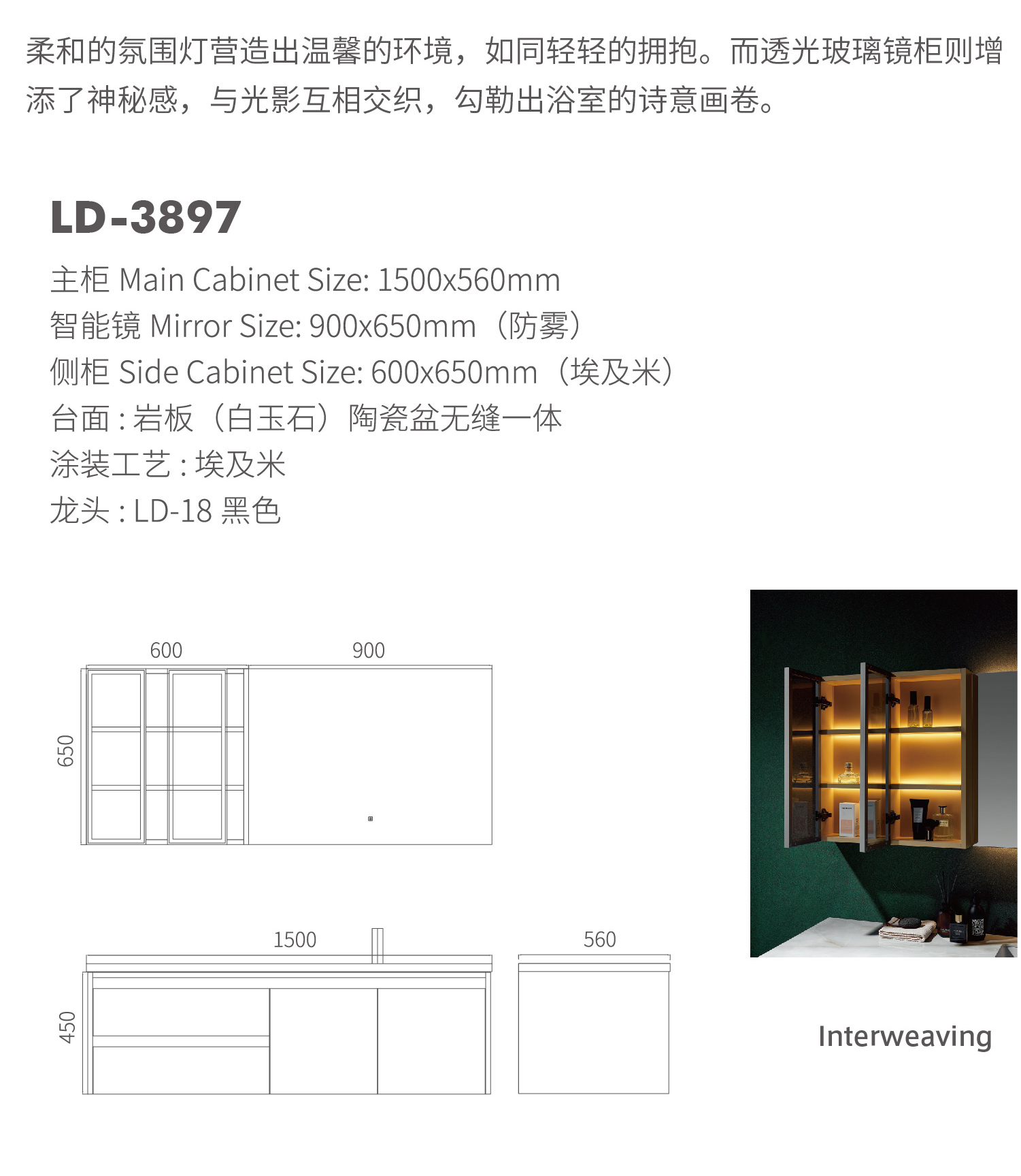 【主 柜】 Main Cabinet Size: 1500x560mm【智能鏡】 Mirror Size: 900x650mm(防霧)【側 柜】 Side Cabinet Size: 600x650mm(埃及米)【臺 面】 : 巖板(白玉石)陶瓷盆無縫一體【涂裝工藝】 : 埃及米【龍 頭】 : LD-18 黑色