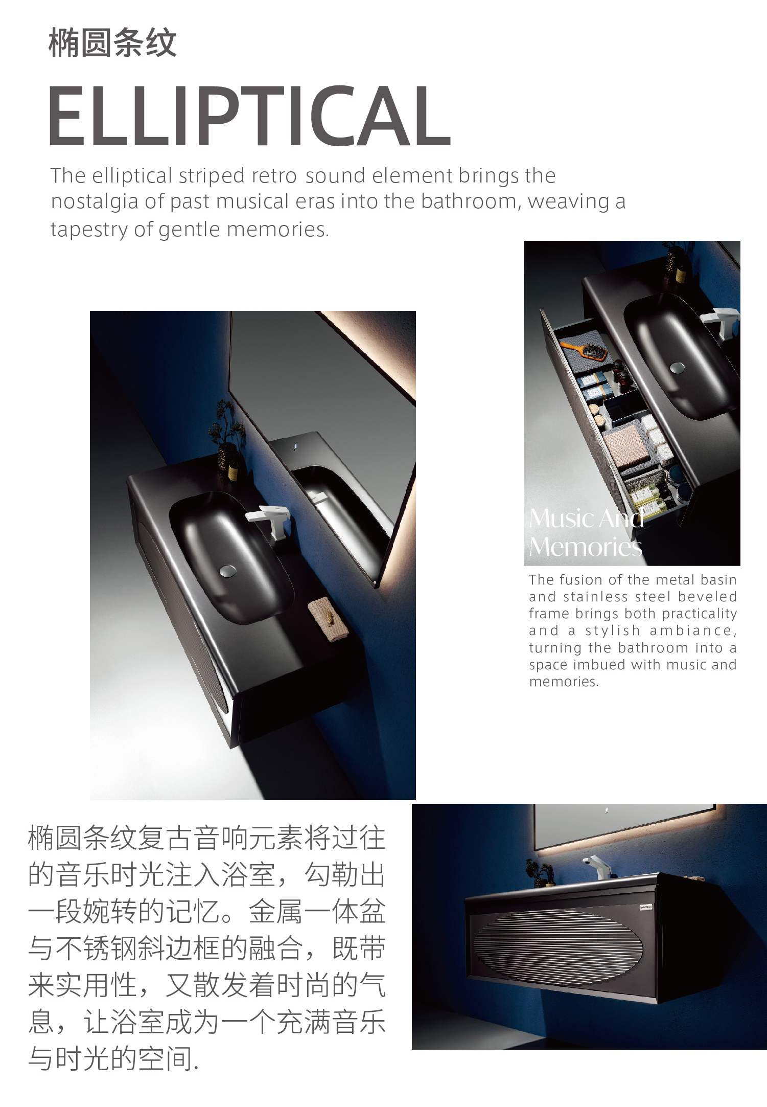 橢圓條紋復古音響元素將過往的音樂時光注入浴室,勾勒出一段婉轉的記憶。 金屬一體盆與不銹鋼斜邊框的融合,既帶來實用性,又散發著時尚的氣息, 讓浴室成為一個充滿音樂與時光的空間。