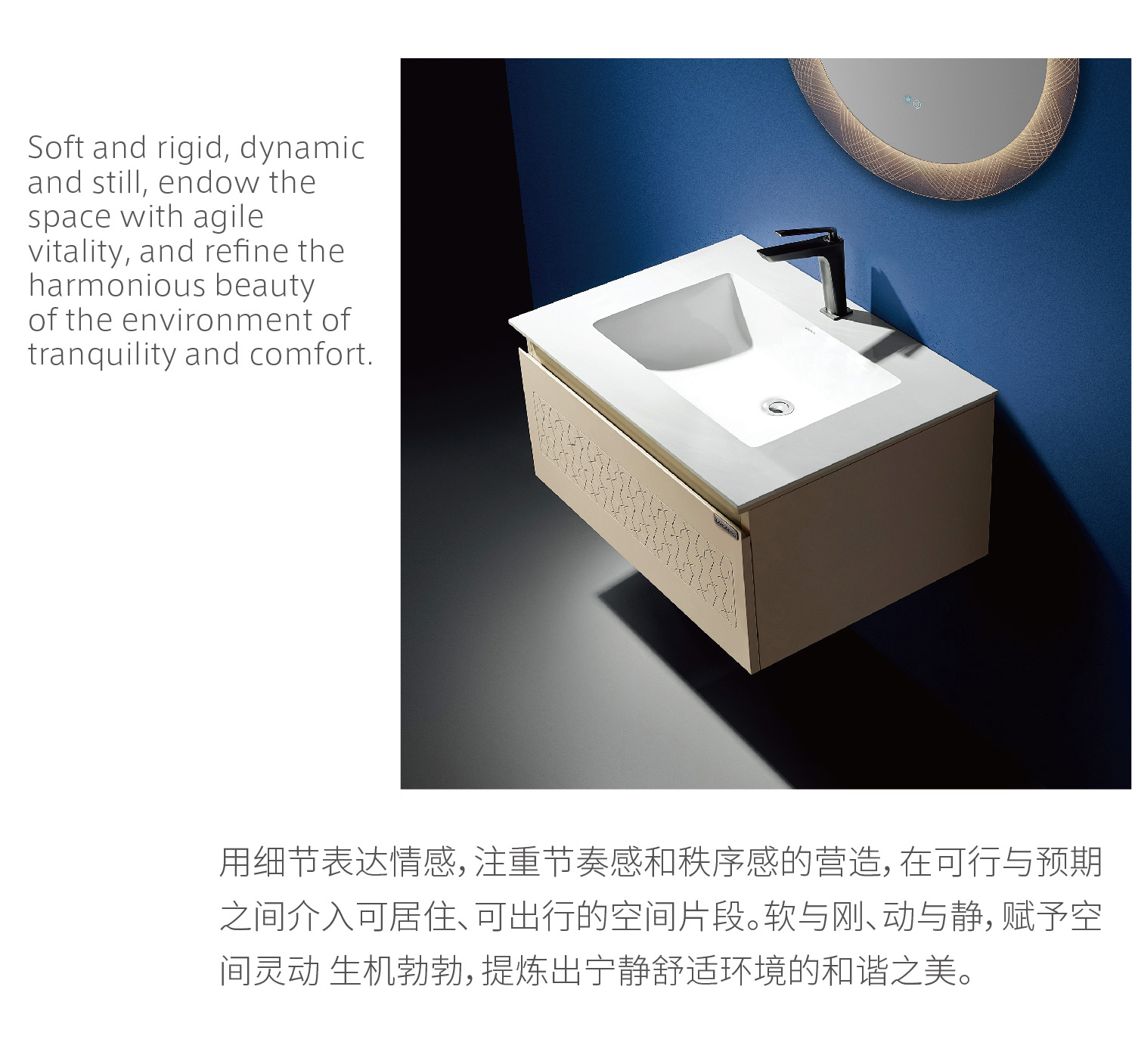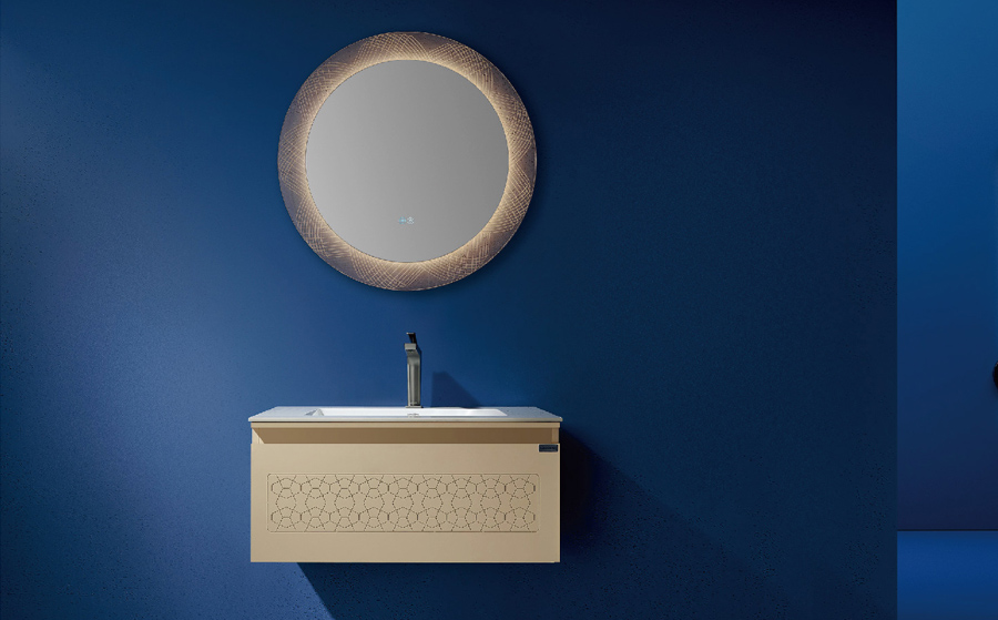 【主 柜】 Main Cabinet Size: 800x550mm【智能鏡】 Mirror Size: 800mm(防霧)【臺 面】 : 巖板(水條紋)陶瓷盆無縫一體【涂裝工藝】 : 埃及米【龍 頭】 : LD-31 鐵灰